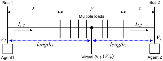 Assume that multiple loads connected between two agents can be concentrated in the middle of the two nearest loads from the agents as shown in Figure 6. Then, define the variables related to the lengths: L is the total length between two agents; length1 and length2 are the distances of the virtual bus from buses 1 and 2, respectively. The distances length1 and length2 are obtained as: