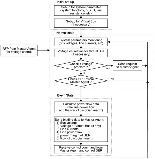 Figure 7 shows the flow chart of control procedures in local agents. In short, local agents have several responsibilities: (1) to check voltage violation problems; (2) to measure local power system data; (3) to calculate the corresponding row of the Jacobian matrix, line power flow, and active power margin of DER and (4) to estimate the voltage of the virtual bus based on local data. Then, send bidding data to the master agent for system-wise voltage control process. Local agents also send control signals to the DER to inject power into the system.