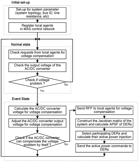 The master agent determines the control command for the AC/DC converter controller and has responsibility to coordinate multiple agents to accomplish efficient voltage compensation. The proposed control schemes for the master and local agents are described in detail in the following sub-sections.