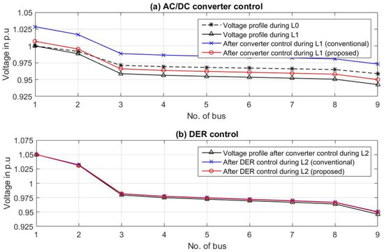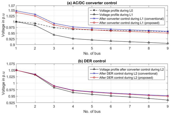 During heavier loading condition (L2), the voltage profile of the LVDC distribution system cannot remain in the normal range even after the AC/DC converter control. In this condition, the DER active power control must be activated. The sixth and eighth columns of Table 5 show the voltage profiles after DER control in the conventional and proposed methods, respectively. Both results are acceptable because the voltage profiles are well maintained within the normal range.