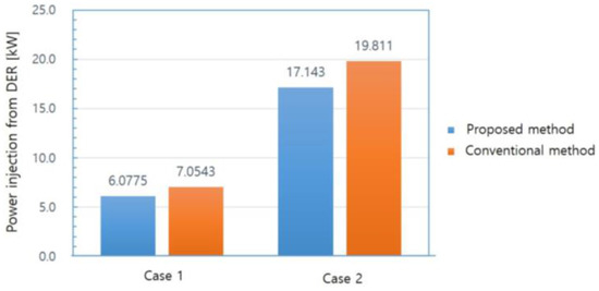 Figure 13 shows the comparison between the power injection of the DER to compensate the voltage problem during heavy loading condition (L2) in cases 1 and 2. For example, the required power injection of the DER at bus 9 is 17.143 W in the proposed method while the conventional method requires 19.811 kW. This means that the proposed method can save 2.668 kW while providing the same voltage compensation. This result shows the main advantage of our proposed method compared to the conventional method because the proposed method can use less active power to solve the same voltage problems in both cases.