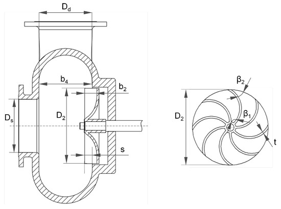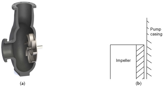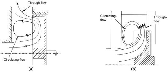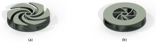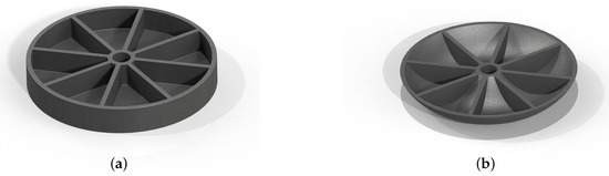 The covered design is sometimes associated with pan impellers whose shape is either rectangular (Figure 3a) or round (Figure 3b). Both impellers were likely designed with the intent to optimize the vortex formation. The geometric closing of both impellers’ radial outlet creates an axial energy transfer to the side chamber. In this case, the round shape (Figure 3b) seems the more suitable form because the round shape guarantees a better guidance of the fluid flow. Overall, it is noteworthy that a pan impeller is not a necessity for the covered designs, although eight out of the 32 investigations on covered designs used them ([9,10]).