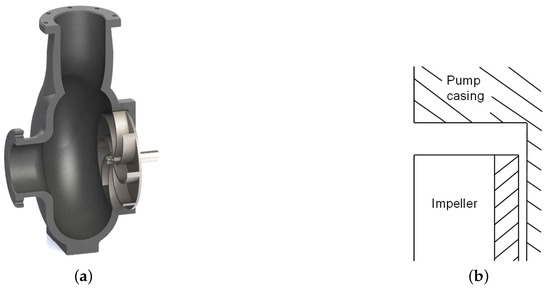 An alternative design principle of vortex pumps is the open design. Here, the casing does not cover the impeller. Instead, the vortex pump looks similar to a centrifugal pump with a semi-open impeller and wide front gap (Figure 4a,b). The assumed operating principle is that of a conventional centrifugal pump: fluids are transported through the impeller itself and without the assistance of a vortex. Due to the wide front gap, however, exchange losses occur. These losses would explain the relatively low efficiency and the relatively low head of vortex pumps compared to conventional centrifugal pumps (e.g., [1]). Given that the working principles of vortex pumps and conventional pumps are similar, it follows that comparable design recommendations apply to vortex pumps as they do to conventional centrifugal pumps. For example, an impeller overlapping with the casing would disrupt the outflow from the impeller and, hence, increase losses.