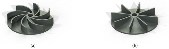 In the open design, the impeller frequently resembles a semi-open impeller, similar to that of a conventional centrifugal pump. The blades are curved or straight and, in both cases, pulled up to the hub (Figure 5a,b). This design can be modified when winglets are added to the front edges of the blades. Figure 6a is an example of an impeller with winglets. The maximal execution on winglets results in a front shroud (Figure 6b).