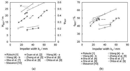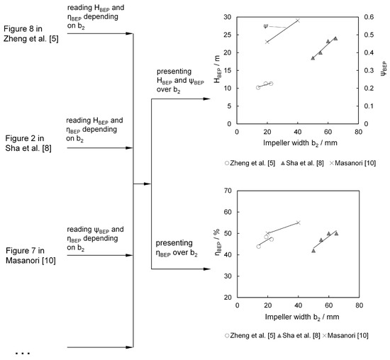 Figure 8 illustrates how the head curves, pressure coefficient curves and the efficiency curves from the primary studies were generated (on the left). The example shows how variations in the impeller width affected the head (H) and the pressure coefficient (ψ; both at the top right panel) and efficiency (η; at the bottom right panel). When integrating primary studies, first the highest efficiency for each impeller width was read off and thereby defining its operation point for best efficiency (BEP). All BEPs were combined into a single graph by plotting them against their respective impeller width. Finally, a linear trend line was fitted through all BEPs of each primary study. These steps were repeated for all primary studies. This representation allows displaying multiple studies in a single graph at the cost of reducing the analyses to comparing BEP values.