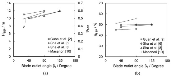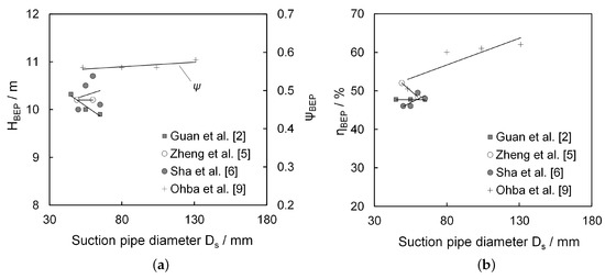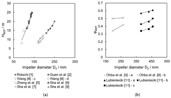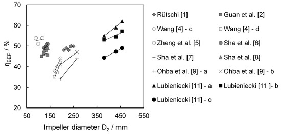 Figure 11 combines the studies of Figure 10a,b and plots the efficiency for the BEP over the impeller diameter. Overall, the trends suggest that greater impeller diameters lead to greater efficiency. However, this trend is not necessarily linear. The studies of Guan et al. [2], Zheng et al. [5] and Sha et al. [8] for example suggest a U-shaped relationship.