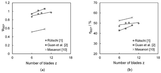 All studies suggest that an increased blade number leads to greater pressure coefficients and greater efficiency. Figure 12a shows the influence of the number of blades on the pressure coefficient for the BEP. Figure 12b plots blade numbers against efficiency. Noteworthy, Rütschi [1] reported a decreasing efficiency for 12 blades. In combination with the other studies, this suggests that more than 10 blades are not beneficial.
