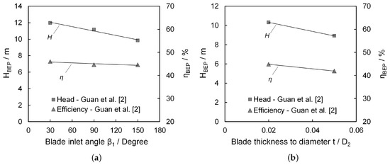 Guan et al. [2] examined the influence of varying the blade inlet angle β1. Figure 14a shows the results for head and efficiency that suggest increasing the inlet angle decreases the head and slightly the efficiency.