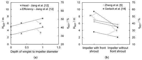 Jiang et al. [12] examined the impact of adding winglets to a semi-open impeller. The study compared two different winglet depths to an impeller without winglets. Figure 15a shows the results for head and efficiency over the ratio of winglet depth to impeller diameter. Overall, the head and the efficiency of the impellers with winglets were lower than those of the impeller without winglets. Decreasing the ratio of winglet depth to impeller diameter was associated with a lower head and lower efficiency. Notably, another study by Gerlach et al. [14] demonstrated that adding winglets to a vortex pump with free outflow from the impeller (i.e., without coverage) and four curved blades led to a greater head and more efficiency. On a further note, Cervinka [24] investigated the operation of winglets using a numerical model. The author compared an impeller with winglets with a geometrically similar impeller without winglets. The study concluded that an impeller with winglets deteriorates the pump characteristic and its efficiency. These results have not been experimentally validated however, and they contradict the measurement results of Jian et al. [12] and Gerlach et al. [14].