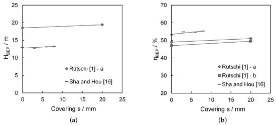 The covering of the impeller refers to the overlap between the impellers’ radial outlet and the casing. Figure 17a depicts how decreasing the covering affects the head for the BEP. At zero, the impeller completely covers the casing. With increasing values, the covering decreases until the impeller is completely uncovered (the maximum value for each study; e.g., 20 mm in Rütschi [1]). Figure 17a suggests that covering the impeller decreases the head. Figure 17b shows the associated efficiencies for the covering of the impeller. This suggests that covering the impeller decreases efficiency.
