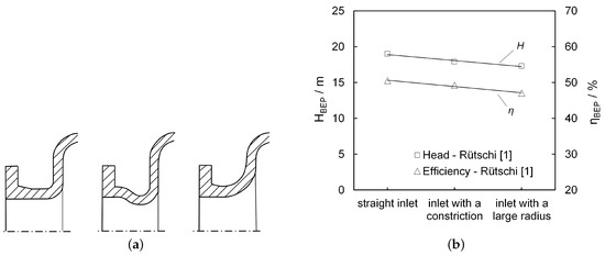 (a) Different inlet geometries of the suction pipes (based on [1]; from left): a straight inlet, an inlet with a constriction and an inlet with a large radius of curvature; and (b) influence of the suction pipe inlet geometry on the head and efficiency.