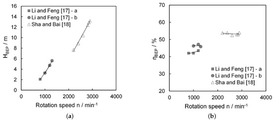 As depicted in Figure 21a, three studies univocally suggest that higher rotation speeds lead to greater head. In contrast, Figure 21b suggests that rotation speed has little effect on efficiency. The effect on head resembles insights on common centrifugal pumps for which similar effects have been observed (e.g., [35,36]).