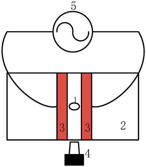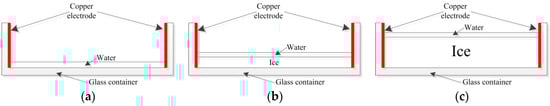 Understanding the effects of the electric field strength on ion distribution in ice layer on insulator string is difficult because of its complex geometries. Therefore, a regular cuboid glass container was used in this part. The conductivity of freezing water in this part was also 200 μS/cm. The test container and freezing water were placed in the climate chamber until their temperature cooled down to −12 °C and near 1 °C, respectively. This cooling ensured that the contact surface between the freezing water and the container was first frozen. The glass container size was 130 mm × 40 mm × 35 mm (length × width × height), and its wall thickness was 5 mm. The copper electrode dimension was 30 mm × 30 mm × 0.5 mm; this electrode was located on the inner sides of the container. Three types of alternating voltage were applied on the electrodes, and the power source was the same as that in Section 2.
