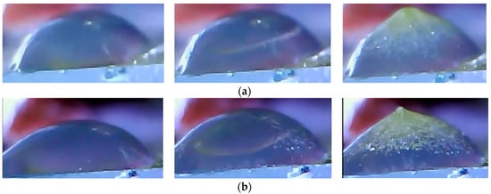 As shown in Figure 2a, the freezing process of water droplets with E0 ( kV/m) can be described as follows. Freezing of water droplets begins with the contact surface between the solid and the liquid. The frontal surface of freezing gradually transfers from the bottom to the top. The movement gradually slows down when the frontal surface is distanced from a cold surface. At the end of freezing, a small obvious raised crystalline lens is formed on the top of the water droplets. The morphological changes in the water droplets during the freezing process show no significant differences with those in the droplets under no electric field condition (Figure 2b).