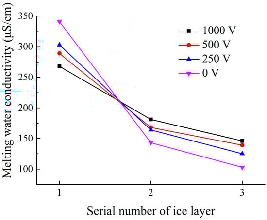 As shown in Figure 4, the maximal melting water conductivity of the ice layer decreases with increasing external voltage. The reason for such observation might be as follows. The electric field strength increases with increasing of external voltage. Combining the analysis above, the movement of ions along the electric field line and polarization and conduction losses would be affected by the increasing strength of electric field, which might be a key factor influencing the extent of ion migration weakening.