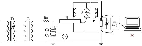 Schematic diagram of AC test circuit. Each part is introduced as follows. T1: Voltage regulator, 10 kV; T2: AC testing transformer, ratio is 1:15; R0: Protective resistance, 100 kΩ; Ri: non-inductive resistance (RX24-50W), 1 Ω; H: High voltage wall bushing, 110 kV; F: AC capacitor divider (ratio 10,000:1); C1 and C2: High and low voltage capacitors; V: Voltage measurement; G: the TVS protecting tube; I: artificial climate chamber; S: insulator string; P: nozzles.