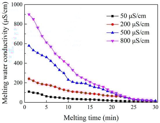 Three units of glass insulator string were used for the icing under the energized condition. The melting water conductivity of the ice layer on No. 1 insulator surface changed depending on melting time (Figure 6). Melting water conductivity continuously declined with prolonged melting time and showed a non-linear relationship with melting time. Melting water conductivity reached its maximum value at the beginning of melting. These values were 100, 241, 579, and 901 μS/cm, which were higher than their freezing water conductivity. Meanwhile, it could be also found that the higher the conductivity of freezing water was, the higher the melting water conductivity of ice layer surface was. The number of conductive ions per unit volume water increased with the increasing of freezing water conductivity, thus leading to the number of ion migration becoming greater. The inner surface of ice layer near the insulator surface had lower melting water conductivity. The minimum values were only 12.3, 17, 18, and 24.5 μS/cm, which were significantly lower than their freezing water conductivity. This result indicates that ion migration occurred during the freezing of water droplets on the insulator surface.