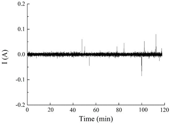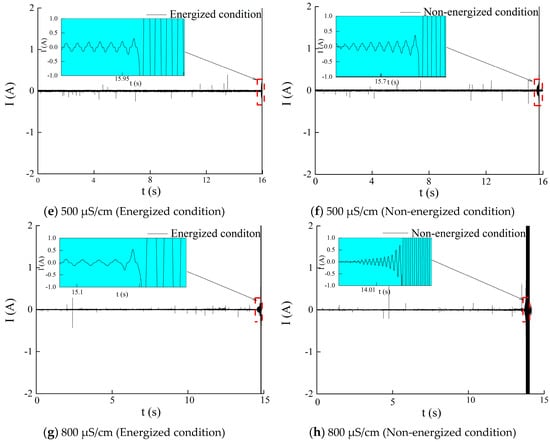 The reason might be as follows. (1) The freezing rate of water droplets on the icicle surfaces decreases because of the heat effect of leakage and partial arcs. Specific analyses are as follows. Freezing water conductivity (800 μS/cm) is taken for an example. The leakage current in the process of icing is monitored, which is shown in Figure 8. The leakage current in most icing process is less than 15 mA. At some certain moments, the peak value of leakage current can suddenly increase near 90 mA. Combing the References [,], when local arc discharge appears, some air gaps are short connected, resulting in body resistance decreasing and higher current. Based on the principle of Joule’s law, heating effect will be produced, which may affect the temperature of ice surface and slow down the icing rate; (2) According to the simulation and experimental measuring in References [,,], the icicle tips make the electric field deform because of the large curvature of the icicles. The electric field strength around the icicle tips increases so that point corona discharge may occur and its heat effect may melt ice. In addition, combining the conclusion in Section 2, the strong electric field strength around the icicle tips might slow down the freezing rate of the icicles accordingly, which further leads to the drainage of highly conductive water. The reasons mentioned above can hinder icicle growth and thus weaken the extent of ion migration.
