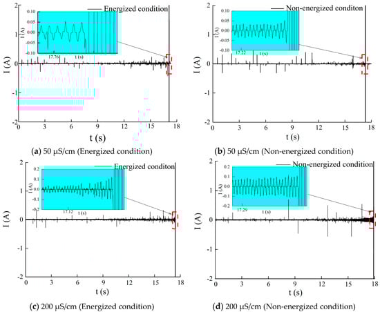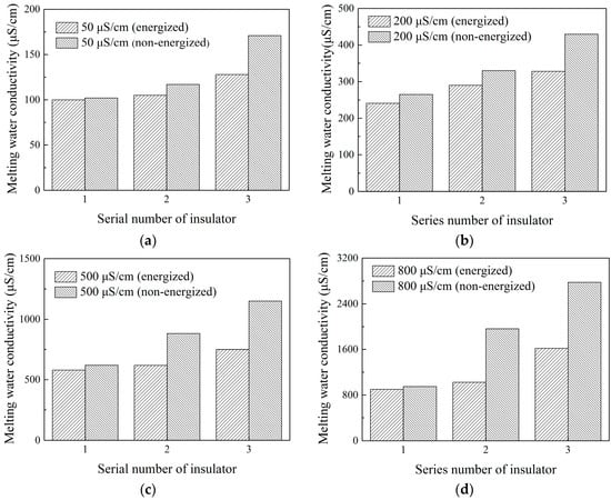 Melting water conductivity under energized and non-energized conditions: (a) 50 μS/cm; (b) 200 μS/cm; (c) 500 μS/cm; and (d) 800 μS/cm.