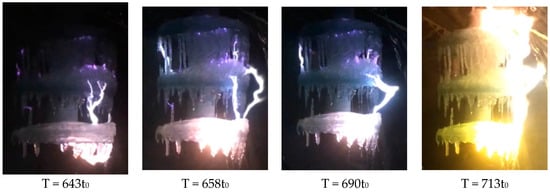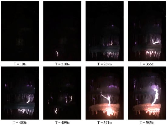 According to existing research results, iced insulators have two discharge paths, namely, the outer surface of ice and the interface between the ice layer and the insulator []. Compared with the interface between ice and insulator, the outer surface is more likely to melt with increasing ambient temperature. Subsequently, a water film is formed, which can dissolve conductive ions quickly and considerably increase conductivity. The high-definition camera (Sony FDR-AX30, Sony, Tokyo, Japan) with fifty frames per second is used to record the flashover process. Other technical parameter of camera is shown in the Table 3. The flashover process lasted for about 14.3 s. t0 means 0.02 s.