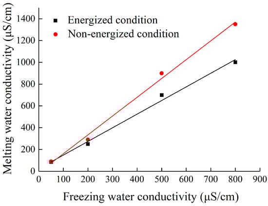 As shown in Figure 7, the melting water conductivity of the icicles under the energized condition was lower than that under the non-energized condition, and the differences increased with increasing of freezing water conductivity.