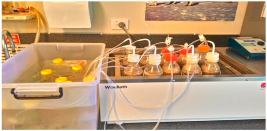 After the pretreatment, the bagasse was fermented with yeast for six days. The pretreated bagasse with acid/alkaline was washed with water to remove the acid/alkaline molecules present in the bagasse. After washing the bagasse, 400 mL of distilled water was added into the reactor along with 3–5 g of Saccharomyces Cerevisiae commonly used bakers/brewer’s yeast. The yeast and the solution were stirred well, and it was ensured that they were covered tightly with the lid. The exhausted CO2 was collected in upside-down plastic beakers (Figure 2), and GCMS and the collected CO2 were used to estimate the quantity of the ethanol produced in each reactor. The reactors were placed in a shaker water bath (Figure 2), the temperature was set to 37 °C, and the shaking speed set to 100 rpm. Then, the biomass (bagasse) was fermented for six days.