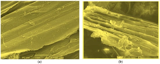 The structure of the bagasse is visualised using an SEM microscope; Figure 3 shows the structure of bagasse before (Figure 3a) and after pretreatment with diluted acid (3%) and an ultrasound (Figure 3b). It is noted that the complex structure of bagasse is destroyed, and the cellulose fibers are now exposed.