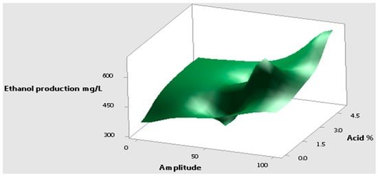 Figure 4 shows a surface plot of ethanol yield against the acid % and amplitude level. The optimum level of the acid % and the amplitude level were identified as 3% and 40–50, respectively. The corresponding ethanol produced is close to 638 mg/L.