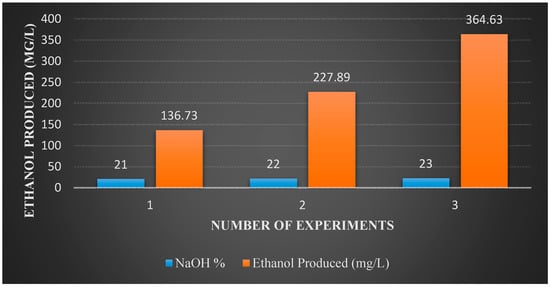 Another set of experiments were conducted to investigate alkaline and ultrasound pretreatment separately and combined. Bagasse was first pretreated with the alkaline (NaOH) solution at different concentrations (21%, 22% and 23%). The pretreatment period was 24 h at room temperature. After 24 h of pretreatment with alkaline, the bagasse was thoroughly rinsed with water for 15 min. Then, the bagasse was fermented with 3 g of Saccharomyces Cerevisiae yeast for six days. The optimum concentration of NaOH was between 22% and 24%. Figure 5 shows ethanol production at different NaOH concentrations. It is evident from the graph, when the result is compared with the acid pretreated, that NaOH pretreatment results in remarkably less ethanol production. The difference is around 400 mg/L, and it is concluded that acid pretreatment is more efficient than alkaline pretreatment.