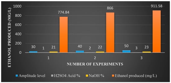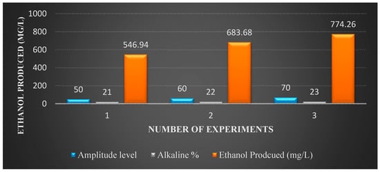 Bagasse was also investigated undergoing three subsequent pretreatments. Bagasse was first pretreated with chemicals: acid (H2SO4) for 12 h, then rinsed with water and pretreated with alkaline (NaOH) solution for another 24 h, and then rinsed with water. After the chemical treatments, the bagasse was pre-treated with an ultrasound with amplitude levels of 40, 50 and 60 for five minutes. Finally, the pre-treated bagasse was added to a 500 mL reactor and 400 mL of distilled water was added. The bagasse was then fermented with 3 g of Saccharomyces Cerevisiae yeast for six days. Figure 7 shows ethanol production for various pretreatment methods of acid and alkaline solutions and an ultrasound. By treating the bagasse with all of the methods one after another, 3% sulfuric acid, 23% of NaOH and an amplitude level of 50, and ethanol production reached 911.6 mg/L.