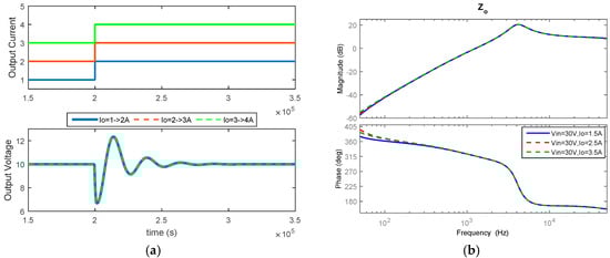 Transient and frequency responses as a function (a,b) input voltage; and (c,d) load current.