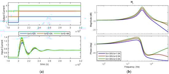 To evaluate back current gain, the input current response is analyzed for step change in load current. In first case the input voltage is kept constant and load current step is applied at different values as shown in Figure 4a,b. In the second case the input voltage is changed for the same load current step shown in Figure 4c,d. It can be seen that in either case, both transient as well as the frequency response vary, indicating 2-d non-linearity. It should be noted that for step change from 2–3 A and 3–4 A the input current values also increases, but the increase is subtracted to match the current value at 1 A, so that comparison for all the responses can be made easily. A similar approach is also used in the figures ahead where there is an increase in input current.