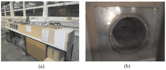 where the variable (J/K) indicates the heating element thermal capacity, (J/K) is the thermal wall capacity (insulated plywood), (J/kg·K) represents the air specific heat capacity, (m2) is the cross-sectional area of the duct, (kg/m3) denotes the air density, represents the supplied constant heat gain, whilst U (J/m2·K) indicates the heat transfer coefficient. Note that in Equations (1)–(3), the term (J/K) indicates the product of the heat transfer coefficient U (J/m2·K) with the efficient surface area, A (m2), through which the heat is transmitted and regarding the TU module. On the other hand, (J/K) indicates the coefficient with reference to the inner duct wall, whilst (J/K) denotes the same term regarding the outer duct wall.