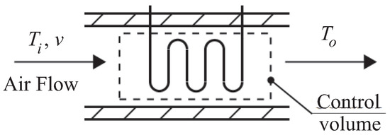 The variables (K), (K) and (K) denote the average heating element temperature, the wall temperature and outside air temperature, respectively. Note that the air surrounding the heating element is assumed to be perfectly mixed. Therefore, the outlet air temperature is equal to the mean temperature of the whole control volume under the lumped parameter modelling approach (see Equation (1)). Moreover, the thermal capacity of the air passing thought the TU element of Figure 2 is assumed to be very small, so that the heat transfer between the heating element and the air is instantaneous. Under this assumption, the left side of Equation (2) is zero. Finally, in Equation (3), it is assumed that the heat loss occurs only through the walls of the duct.