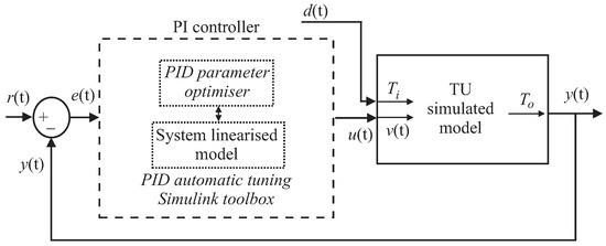In the remainder of this section, different control laws and their implementations are summarised. The methods include the standard PID regulator and nonlinear control methodologies relying on AI techniques, such as FL and adaptive schemes, as well as the model predictive control. These control strategies, which are exploited for the the regulation of the outlet air temperature , will be applied to the TU system of Figure 2 described by the model of Equation (4).