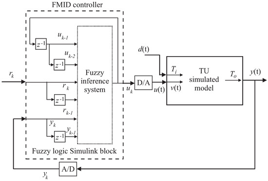 In this way, the FMID approach estimates the parameters , and the membership functions . Moreover, this strategy is exploited again for identifying the mathematical description of the fuzzy controller that minimises a suitable cost function of the tracking error . Note finally that the FL controller in the form of Equation (11) is implemented as discrete-time model that will be connected to the TU process of Equation (4) via suitable Digital-to-Analogue (D/A) and Analogue-to-Digital (A/D) converter devices [31].