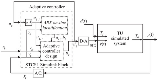 This study proposes the derivation of the controller model for the regulation of the TU module of Section 2 by means of an adaptive strategy. This on-line approach relies on the recursive identification of second-order discrete-time in its difference form of Equation (12):