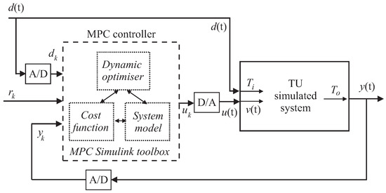 Finally, with reference to the MPC strategy summarised in Section 3.4, Figure 12 reports the block diagram of the MPC applied to the TU module via the D/A and A/D devices. The scheme of Figure 12 assumes that the disturbance signal can be measured and exploited by the MPC block.