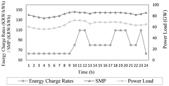 The energy charge rates shows a similar pattern with the entire power system load. In the case of a cost-based pool market, like Korea, a generator with the highest marginal cost determines its market price in the wholesale electricity market, which is called the system marginal price (SMP). An amount of demand affects SMP; in other words, more demand requires a more expensive generator, raising SMP. Hence, SMP results in having a very similar pattern to the entire demand pattern. Energy charge rates are generally designed to reflect the variability of the wholesale market to the retail market, so their patterns really approximate the SMP. Therefore, the energy charge rates, SMP, and the entire demand display a similar pattern (Figure 1). Both SMP of whole electricity market acting on the pricing of power suppliers and energy charge rates levied on end-users offer a proper remuneration for supplied electricity, and an inducement to shift the demand from a high to a low demand area at the same time.