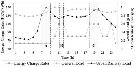 Not only can the urban railway loads, but any load whose demand pattern is different from the general load pattern—for example, load’s peak demand regularly occurs during non-peak price time (illustratively, A part in Figure 2)—be similarly analyzed like this.