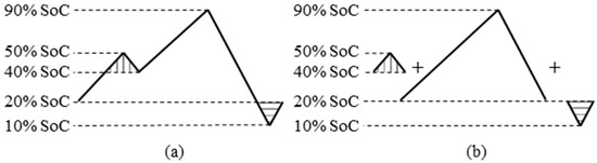 Battery degradation occurs due to stress by time, heat, and charging and discharging cycle. State-of-health (SoH), which represents the status of battery degradation, can be expressed as a single lumped damage parameter, L, which can be expressed as a function of the average and deviation of SoC and thermal parameters. Additionally, the definition of two variables relating to SoC is shown in Equations (1) and (2) [18]: