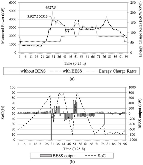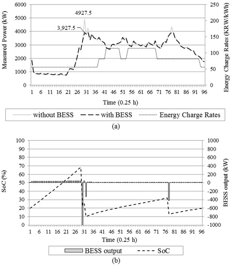 In Case 2, the original peak demand, 4927.5 kW, decreased to 3927.5 kW by BESS operation. The demand in the closing hour also declined for the changed peak demand to become a new peak demand within the BESS operation period. We can see BESS does not react for charge reduction in the section with a high energy charge rate as it operates for demand charge minimization only (Figure 4a). It declines the customers’ peak load only, so its charging and discharging cycle proportionally operates to peak scale once or twice a day (Figure 4b).