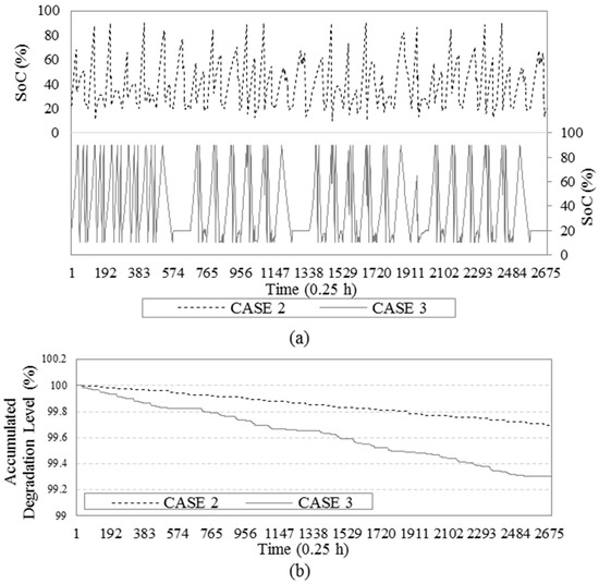 Impact of operation strategies on degradation by case: (a) SoC, and (b) accumulated degradation level.