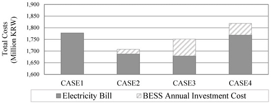 We have seen that Case 3 saved more electricity charges than Case 2, and also lowered the customer’s, and the entire peak, loads. Considering the annual investment costs derived from the degradation model, however, Case 2 is in a more favorable position than Case 3 in terms of total costs (Figure 7). This signifies BESS operations used for additional energy charge reduction bring more loss than the savings due to degradation. We can confirm this in Case 4, which demonstrates BESS operations for only energy charge minimization incur more costs in degradation compared to the reduced amount in charges in Case 2.