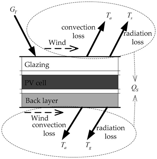 The schematic of the heat transfer process of the PV cell is shown in Figure 1, where Tg and Ts, are the temperature of ground and the temperature of sky, respectively. Here, Tg and Ts are all assumed to equal to Ta.