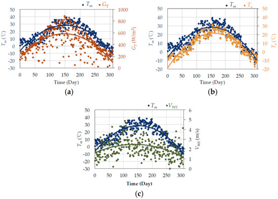 Scatter diagrams and fitting curves between each MIF and PV module temperature: (a) PV module temperature and solar irradiance; (b) PV module temperature and ambient temperature; and (c) PV module temperature and wind speed.
