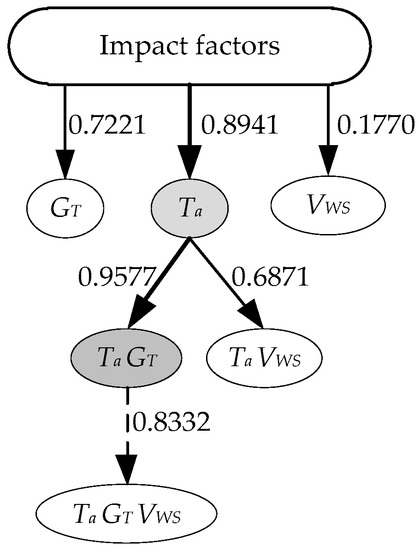 The ratios of quantitative redundancy degrees between Ta and GT, Ta and VWS, GT and VWS are 61:28:11, 57:30:13, 62:26:12, and 62:33:5, respectively, under four GWCs. The redundancy between solar irradiance and ambient temperature is highest in three variables, which is caused by the significant effect of solar irradiance to ambient temperature. Wind speed also influences the ambient temperature by accelerating heat transfer, which reflects in the higher values of I(Ta; VWS; Tm). Wind speed and solar irradiance have little redundancy relation.