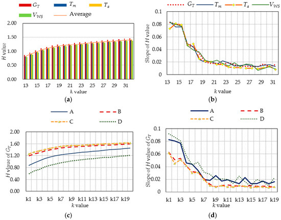 (a) H values of variables with different k values in weather class A; (b) slope values of H values with different k values in weather class A; (c) H values of GT in four GWCs with different k values; and (d) slope values of H values of GT in four GWCs.