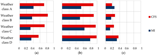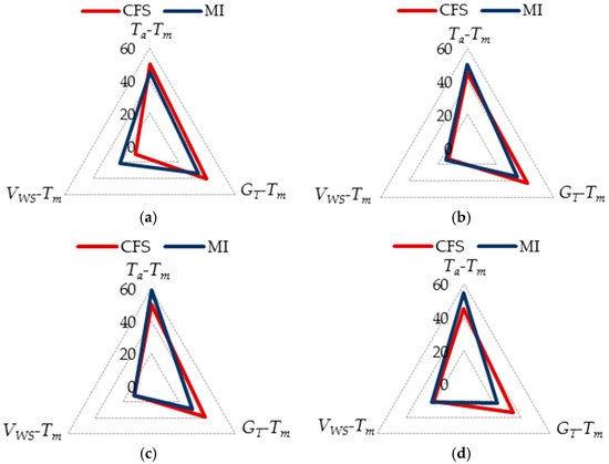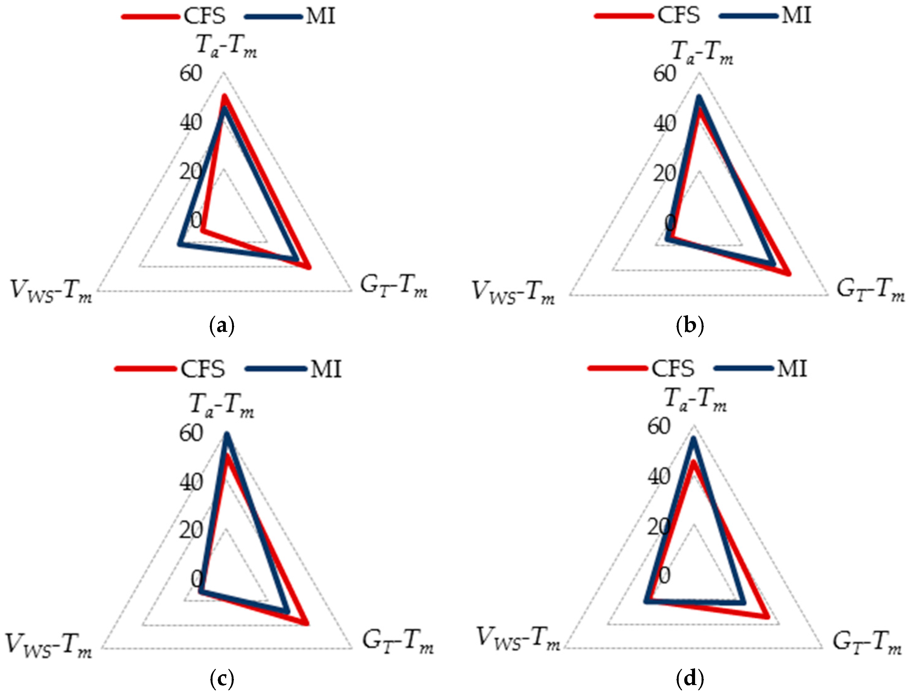 Relevancy between MIFs and PV module temperature measured by correlation-based feature selection (CFS) and MI: (a) in weather class A; (b) in weather class B; (c) in weather class C; and (d) in weather class D.