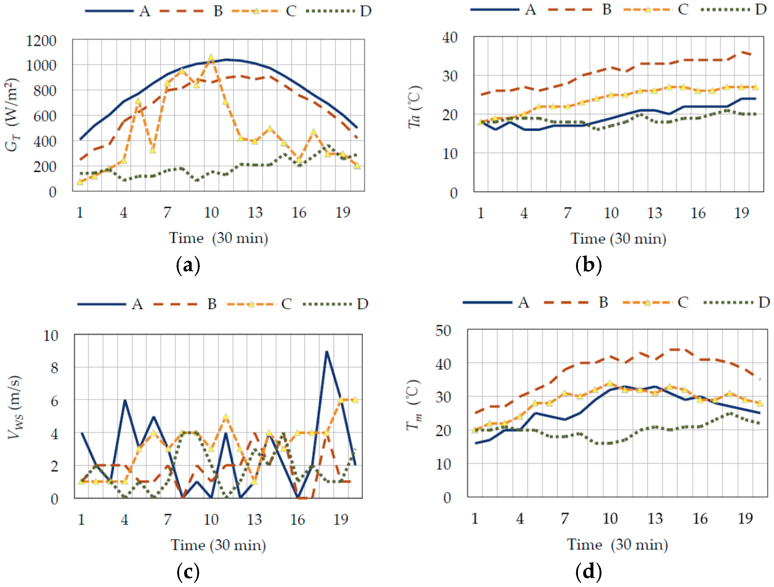 Figure 4 is the actual data of PV module temperature and its MIFs on a certain day under four GWCs. The dates selected to represent the rules of four GWCs are 10 June, 18 June, 24 June, and 6 June respectively. It is shown that the changes of PV module temperature are the common interaction among all three MIFs. For example, in weather class A, although the solar irradiance is much stronger, the ambient temperature is lower and the wind speed is bigger than in other classes, so the PV module temperature is not very high.